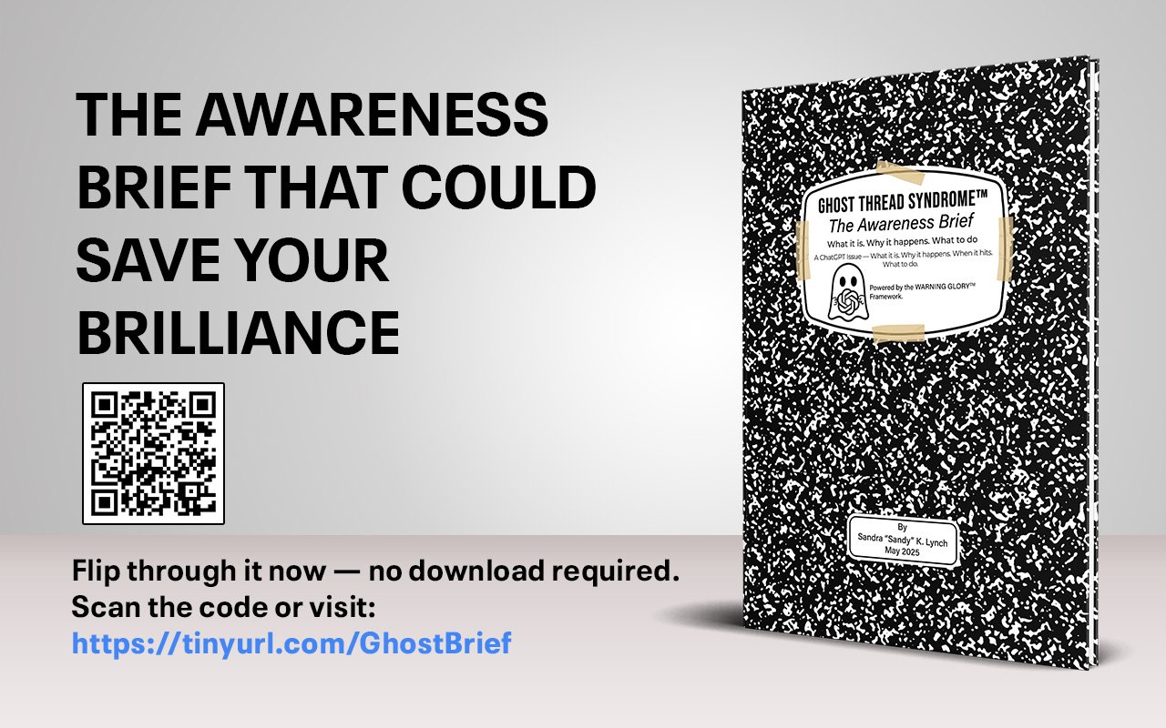 Protect your AI-powered business from silent content loss. This 29-page briefing + mini-course reveals how Ghost Thread Syndrome™ is quietly disrupting your ChatGPT conversations—and gives you the tools to SAVE, RESTORE, and MAINTAIN your creative flow.