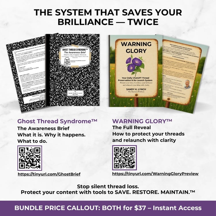 Her flagship tools — WARNING GLORY™ and Ghost Thread Syndrome™ — are designed to help you SAVE, RESTORE, and MAINTAIN your ChatGPT threads, project workflows, and all the genius you're building online.